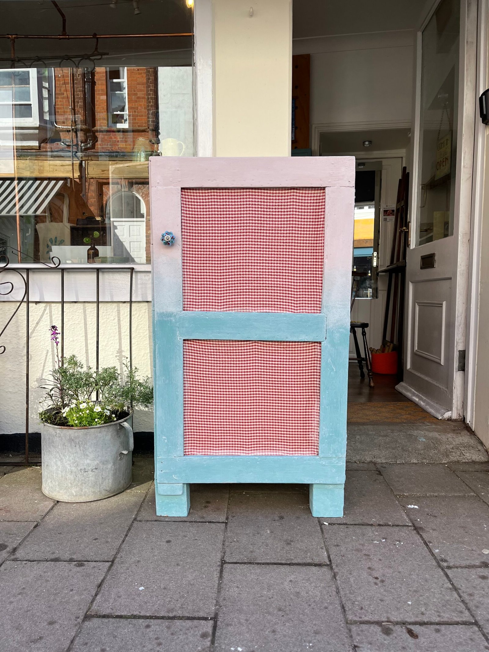 Provence blue ombre with Antoinette pink and sealed with white wax for durability (fully wipeable and waterproof). Solid oak frame with useful shelves inside. Gingham fabric panel and floral teal and pink ceramic handle. Funky fun storage. What is not to love?