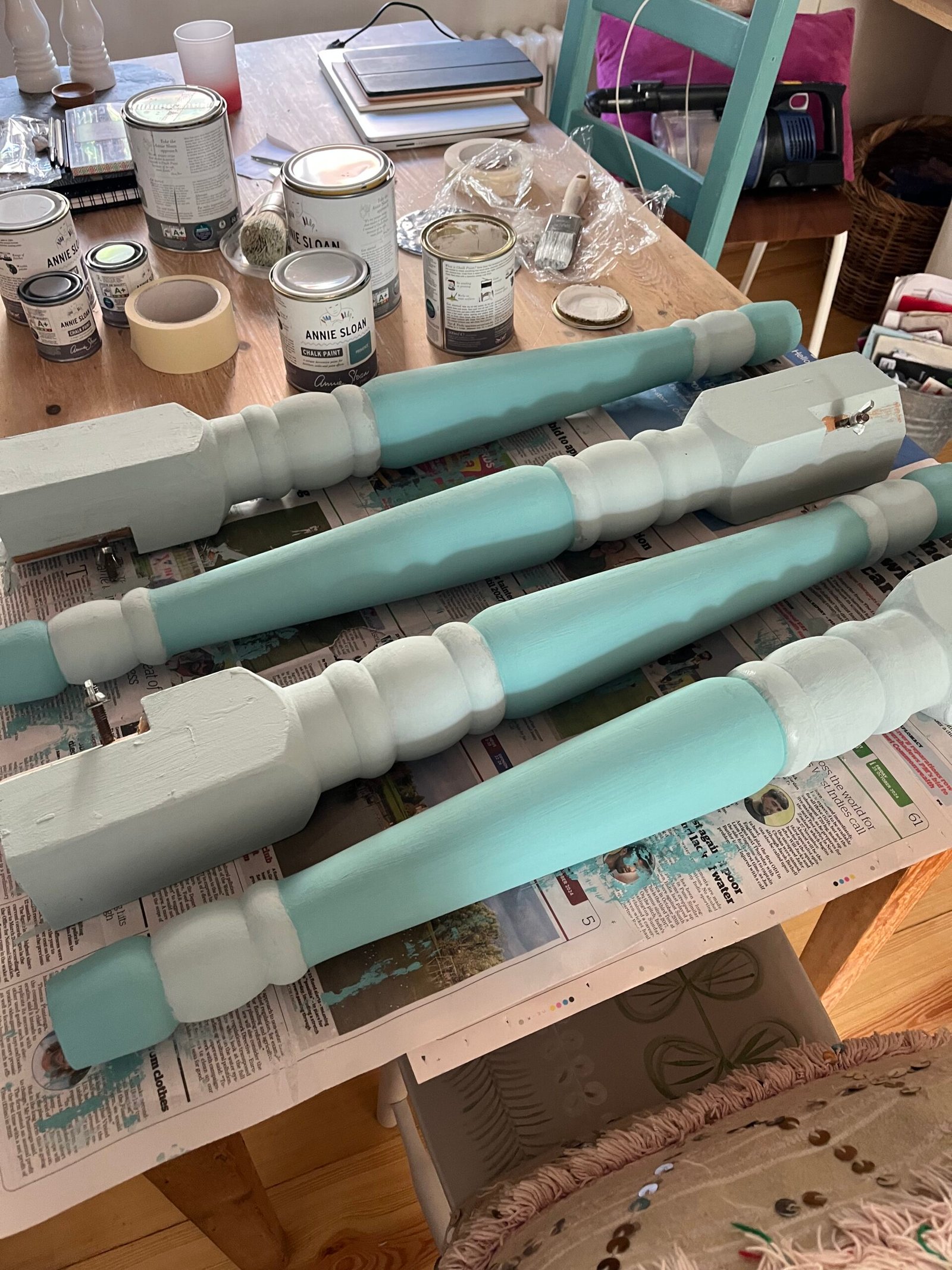 This gorgeous hand-painted table, seats 4 comfortably and would work well in as a cosy kitchen table or as funky dining room statement piece! Each leg is treated with contrasting pallet of Svenska Blue, Duck Egg and Provence. The table top is painted using a distressed technique with Pure White, Provence and Gold Leaf. The whole table has been coated with wax and heat sealed giving it durability (fully wipeable and waterproof).