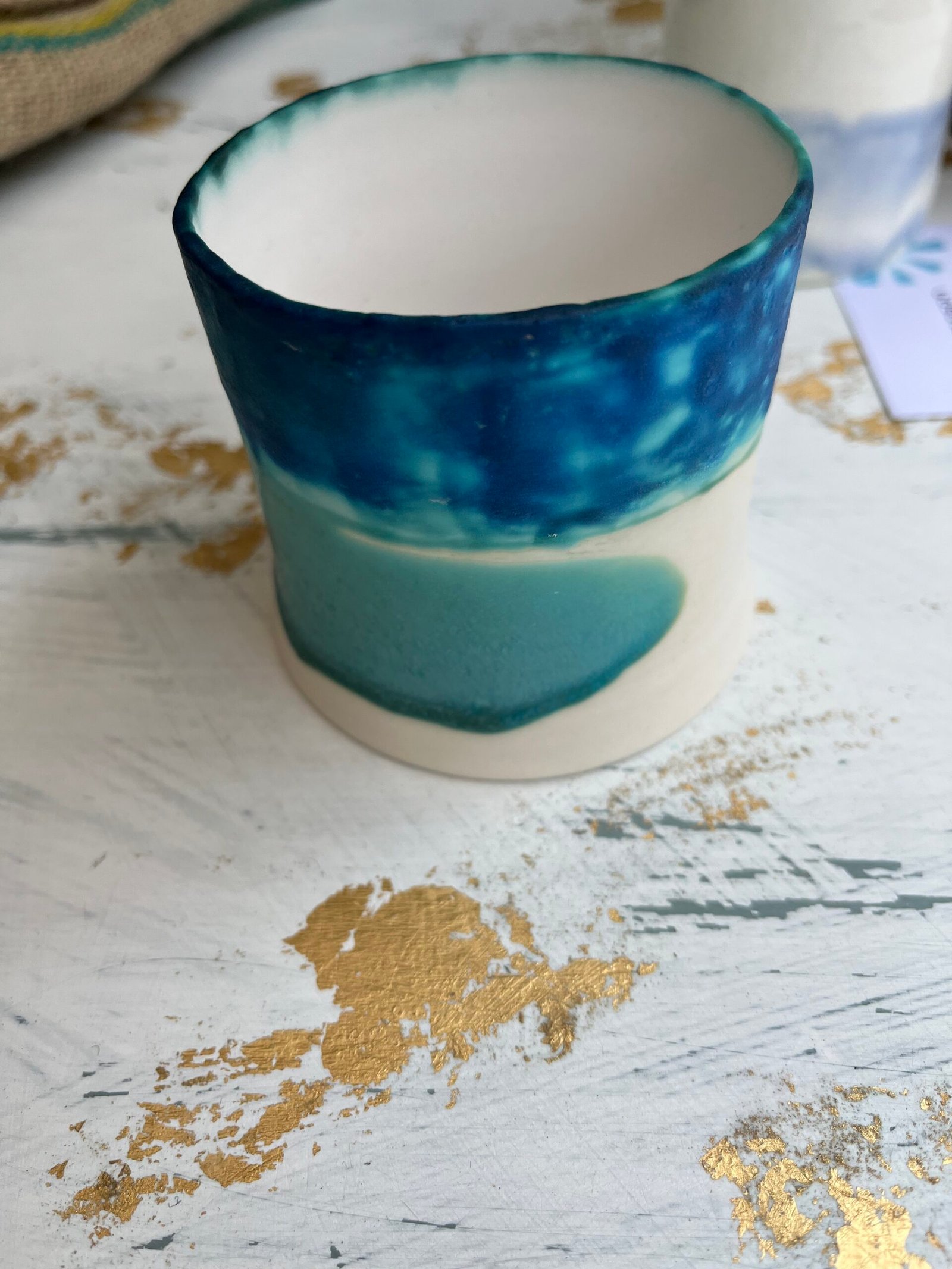 This is a stunning statement piece mirror which looks great hung up on a wall but is equally striking just leant casually up against a wall! Hand-painted with Napoleonic Blue and Provence with a flash of gold leaf. When I look at this mirror I imagine myself diving into the ocean and swimming under water away from of the noise of of everyday life!